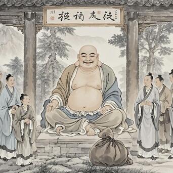 布袋和尚,五代后梁时期的僧人,常活动于浙江宁波一带。他身材矮小,圆腹宽肚,总是背着一个大布袋,袋中装满了各种物品。布袋和尚行踪不定,经常出现在市井之间,看到鱼肉便随手放入口中,剩下的则放入布袋。他性格随和,生活随性自如,深受百姓喜爱。